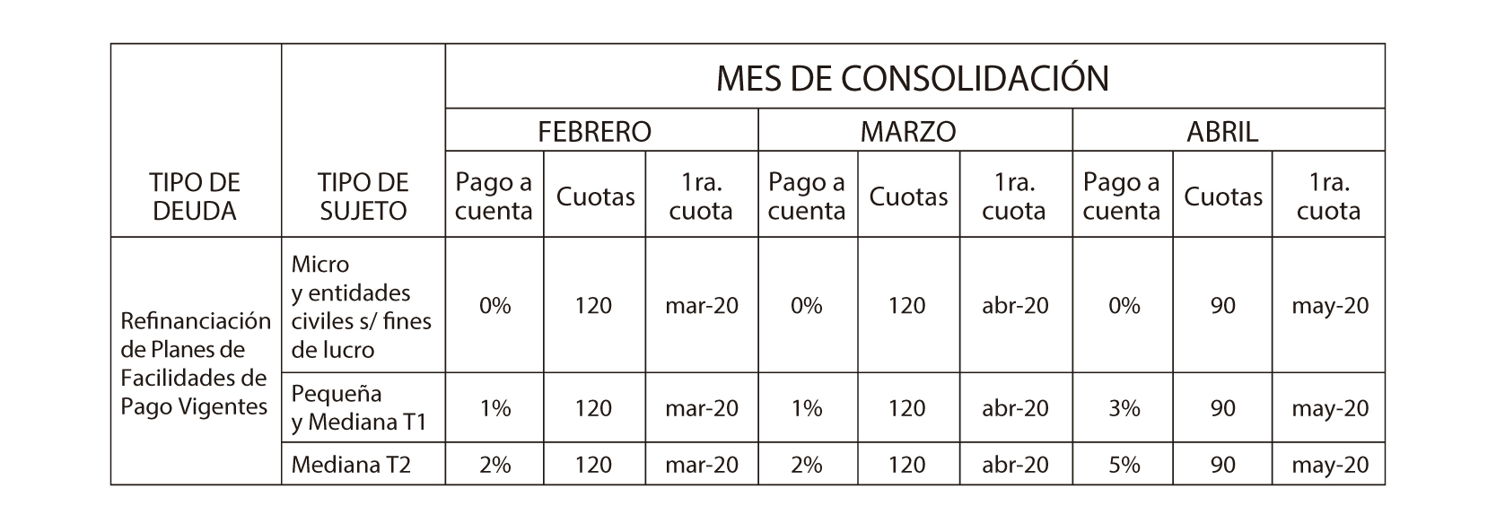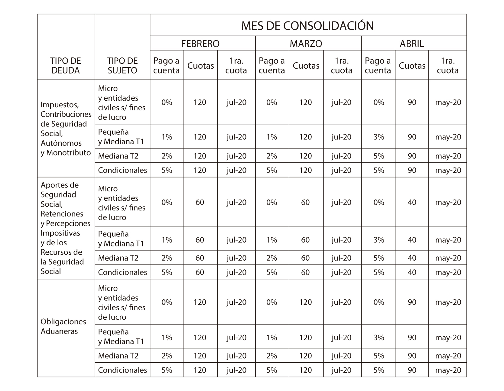 máxima de cuotas y el mes de vencimiento de la primera cuota del plan, serán los que -según el tipo de sujeto y el mes de consolidación-